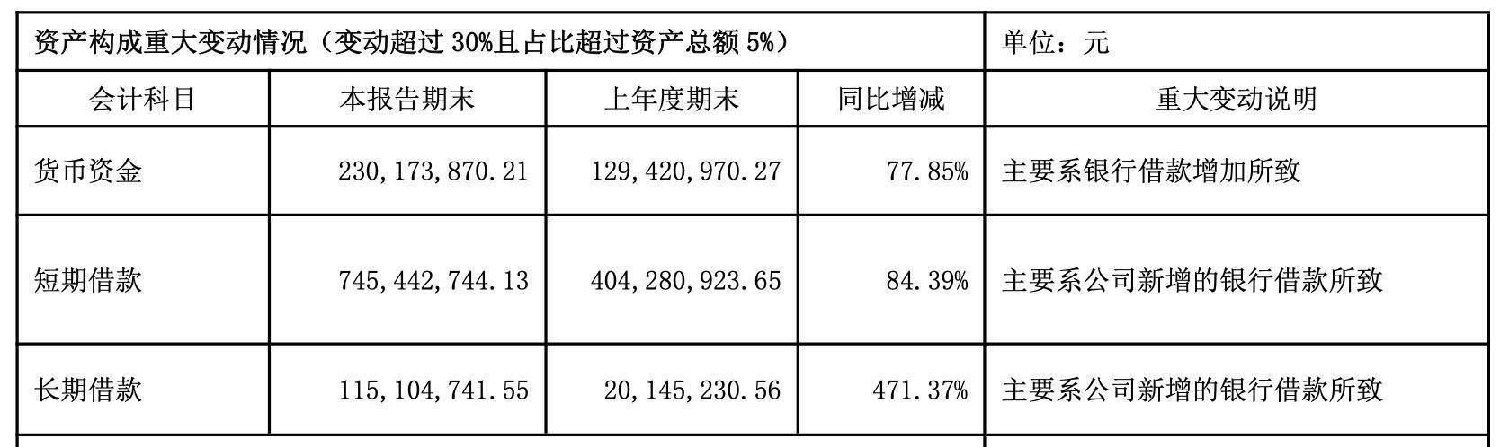 三季报显示,公司短期借款由4.04亿元增至7.45亿元,长期借款则由2014.52万元增至1.15亿元。