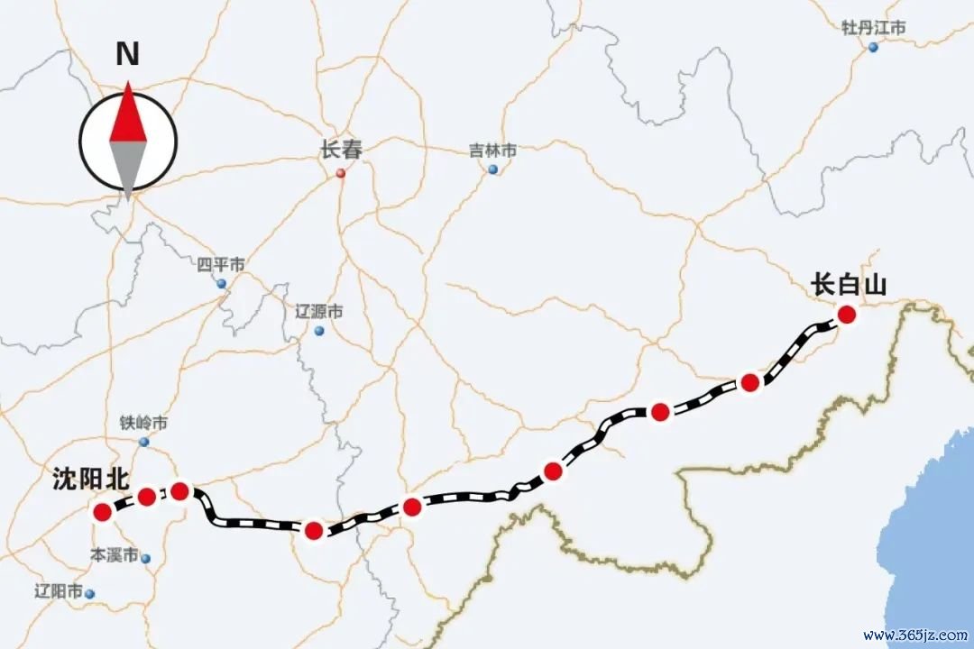 沈白高铁正线起自沈阳北站,沿线经沈阳市、抚顺市、通化市、白山市、延边朝鲜族自治州等5个地市(州),终至长白山站,全长约430公里,设计时速350公里,全线共设沈阳北、伯官、抚顺、东韩家、新宾、通化、白山东、江源东、长白山西、长白山站10座车站。